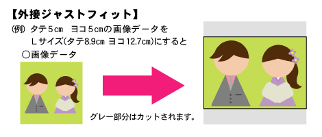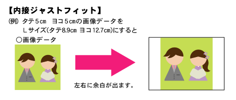 「外接ジャストフィット」は画像データがどんなサイズであっても、写真に余白が出ないようにプリントされます。下記のように画像データが正方形などの場合は、上下がカットされて仕上りますので、ご注意下さい。